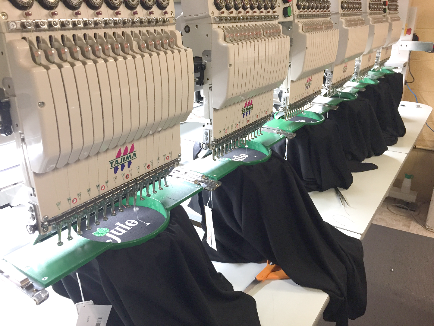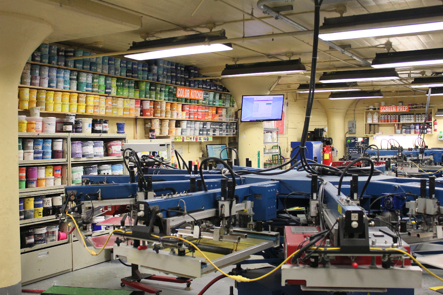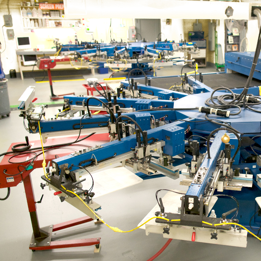 We have a modern, state of the art screen print production floor with multiple automatic presses capable of producing high volume orders in short amounts of time.